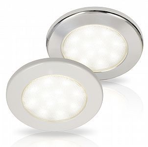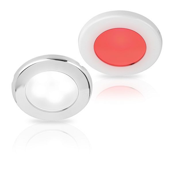 HELLA EuroLED75 White/Red Recess Mounted LED LightsRecessed, sealed 3W 80deg LED downlights brighter than 10W halogen. Switch to integral second red light to preserve night vision. Leading LED technology delivers exceptional colour rendering, reproducing colours in their natural richness. Producing an impressive output of 190 actual lumens, with a diffused lens, creates a bright, broad and even illumination, replicating the pleasing appearance of a traditional round lamp - giving you the best of both worlds. Dimmable cool or warm white. White 75mm plastic or 316 stainless steel 72mm bezels. 12V only, Screw or spring mount, cut d50/d54mm, 16/21mm intrusion.
