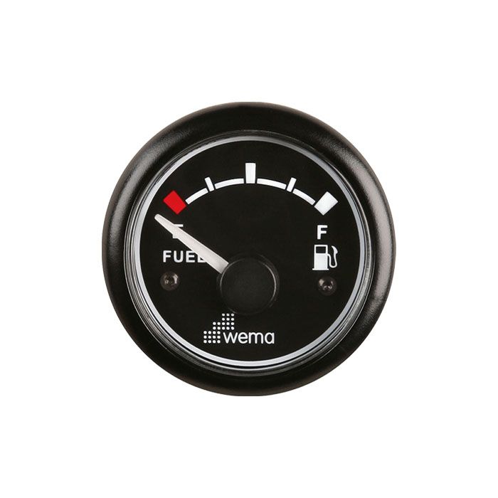 Fuel Gauge 10-180 ohm WEMAA range of gauges for monitoring fuel tank levels. These units utilise various types of sender units for a variety of mediums including petrol, diesel and fuel oil. Popular for auxiliary tanks in vehicles. Only compatible with European sender units{10-180 Ohm}. 52mm diameter available with a black plastic bezel.