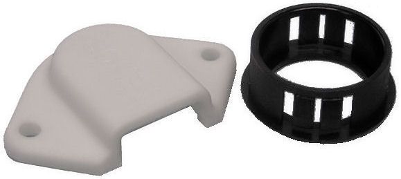White Plastic Cover for Cable Outlet with BushWhite plastic cover for cable outlet with sealing bush. 48mmW x 32mmH, 9mm protrusion, cut d 28mm, cable aperture 17mm x 5mm.