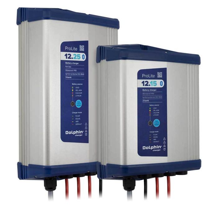 Dolphin PROLITE IP65 Battery ChargersDolphin PROLITE battery chargers offer the most complete technical specifications on the market PROLITE is rated IP65, totally dust-tight and protected against dripping water, spraying water and splashing water as well as against water jets. PROLITE is super-compact and light, the perfect charger for small spaces. PROLITE is protected against ignition of flammable gases which makes it ideal in combination with petrol engines. One of the most efficient chargers on the market. 92% of the power which comes in is converted and comes out through 2 outputs [15A version] or 3 outputs [25A]. Thanks to its high efficiency and natural convection cooling, PROLITE is a fan-less charger which makes it totally silent. PROLITE is therefore perfect for mounting anywhere into living spaces on board. PROLITE chargers feature a Bluetooth interface and the brand-new "Dolphin Connect" App as standard equipment, that allows charger configuration, a diagnostic fault finding function, as well as a dashboard showing current charge status, including charge cycle stage, current and voltage and well a historical number of charge cycles. PROLITE chargers work with any battery type on the market including Lithium Ion. Warranty 2 years.