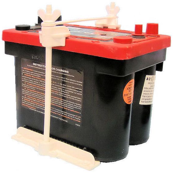 Battery Tie-down, White PolypropyleneBattery tie-down, white polypropylene. Nylon bolts and wing nuts, impervious to battery acid. Max battery size 200mm high x 170mm wide.