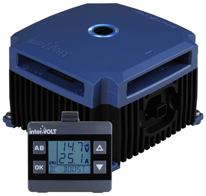 interVOLT DCC Pro DC to DC battery chargerThe interVOLT DCC Pro is a true 25 Ampere DC to DC battery charger, i.e. it draws power from a primary battery to charge an auxilliary battery. It has selectable charging profiles for four different battery tecnologies, including lithium phosphate. This makes it the ideal choice where btteries of differeing technologies must be charged together, e.g. a Lithium Phosphate battery can be charged from a flooded lead acid battery, so charging systems need not be modified when a new battery technology is added tinto the system. In addition, the DCC Pro is a complete MPPT solar charge controller capable of controling 250 Watts of solar power with up to 30% greater e¬fficiency than a standard PWM regulator, no need for a separate regulator or relay. The DCC Pro is kitted with an interactive, remote mount display for remote monitoring of the auxiliary charging status from both main and solar power charging sources. The remote display is not waterproof and must be mounted in a dry area. DCC Pro Remote Display can accept and monitor two Individual Charging Devices at once! No need to purchase a second display when two auxiliary batteries are used. A 4m long data cable to link the DCC PRO to the remote display is included as standard in the kit. Cables of other lengths are optionally available The DCC Pro is sealed to IP67 standard and can be mounted in the engine bay or on the chassis if fitted to a vehicle. The DCC Pro is capable of temporary submersion in water.