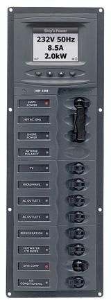 BEP 900-AC2-AM and DH AC PanelsBEP 900-AC2AM and BEP 900-AC2DM have 2 double pole mains circuit breakers [1x20A, 1x30A] with slide lockout [ship-shore], 8 single pole circuit breakers [1x5A, 3x10A, 3x15A, 1x20A], a reverse polarity light and an analog voltmeter or a digital meter in a horizontal [almost square] configuration. Supplied with label set 5 and two 6 way distribution busses.