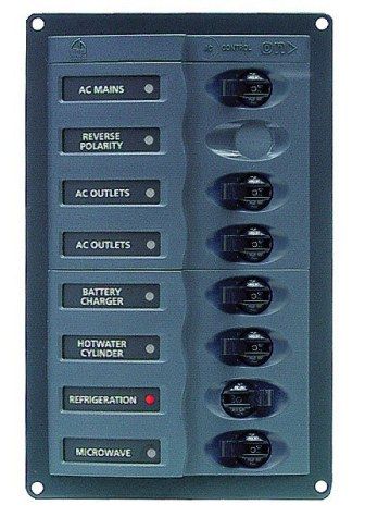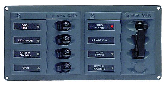 BEP 900-AC1 AC PanelBEP 900-AC1 has 2 double pole mains circuit breakers [2x20A] with slide lockout[ship-shore], 4 single pole circuit breakers [2x10A, 2x15A] and a reverse polarity light, no meter. Supplied with label set 5 and 2xM6 distribution studs.