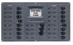 BEP 900-AC4-ACSM AC PanelBEP 900-AC4-ACSM has 2 double pole mains circuit breakers [1x20A, 1x50A] with slide lockout [ship-shore], 16 single pole circuit breakers [1x5A, 5x10A, 7x15A, 2x20A, 1x25A], a reverse polarity light and a digital meter in a horizontal configuration. Supplied with label set 5 and two 12 way distribution busses.
