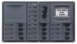 BEP 900-AC4-ACSM AC PanelBEP 900-AC4-ACSM has 2 double pole mains circuit breakers [1x20A, 1x50A] with slide lockout [ship-shore], 16 single pole circuit breakers [1x5A, 5x10A, 7x15A, 2x20A, 1x25A], a reverse polarity light and a digital meter in a horizontal configuration. Supplied with label set 5 and two 12 way distribution busses.