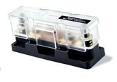 BLUE SEA T-Class FuseholdersBlue Seas Systems heavy-duty fuseholders with clear insulating covers for T-Class fuses have cover breakouts to allow cable access from all sides. Tin plated copper mounting blocks provide ample heat dissipation. Stainless steel mounting studs. Note that size of T-Class fuses varies with rating, Blue Sea systems offer fuse holders in two sizes, for 110A to 200A fuses and for 225A to 400A fuses.178mm x 34mm x 59 mm[h].