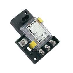 Bussmann Marine Rated Battery Terminal FusesThe Bussmann Marine Rated Battery Terminal Fuses MRBF are colour coded DC fuses ranging from 30A to 300A that can be mounted to battery terminals, bus bars or battery switches using special holders or bus bars. Ignition protected and suitable for use in enclosures with petrol engines, these fuses have a high enough interrupt rating to permit them to be used as primary circuit protection on large battery banks. The fuses have a visible window to see blown condition. The compact design is a feature, but care must be taken to understand their function to avoid inappropriate and potentially dangerous installation. The design of these fuses places the fuse between the top and bottom contact areas. It is crucial that the central 8mm mounting stud or bolt does not provide a path for current to bypass the fuse, thus rendering it ineffective. An insulator is required to isolate the stud from either the unfused or the fused section of the fuse. All the mountings for these fuses advertised on this website do this.