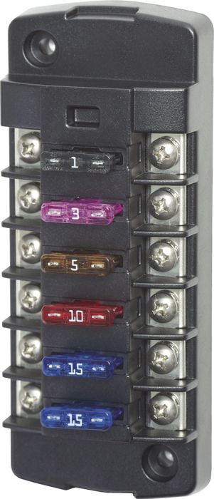 Blue Seas Blade Fuseholder Independent 6 poleCorrosion resistant, tin-plated copper fuse clips reduce heat and improve the efficiency of the electrical system Accepts ring or snap fork type terminals Includes two terminal block jumpers.