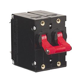 Carling A-Frame Hydraulic Double Pole Circuit Breaker-switches (red actuators)These breaker switches are dual pole versions of the single pole breakers above with 2 red actuators linked by a bar. Cut 2xd16mm@19mm pitch, 51mmHx39mmWx52mmD.
