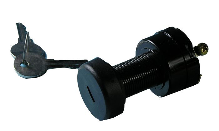 MERIT Ignition & Starter SwitchMERIT ignition & starter switch. Plastic body. 4 positions, accessories-off-ignition-start. 4 screw terminals & satin finish face nut. 2 keys with plastic grips. Cut d19mm. Panel 6mm max. d44mm, intrusion 62mm