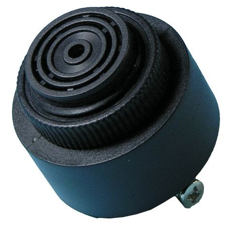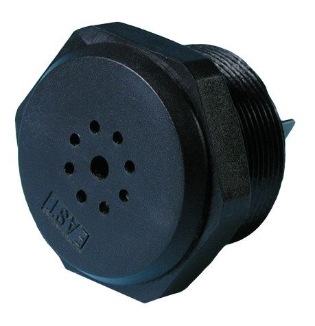 Buzzer Piezo Two-toneBuzzer, dual continuous/pulsed high pitch tones, 12/24V DC. Not waterproof. 4,8mm spade terminals. Panel mount from front, lock nut behind, OD36mm, cutout d32mm, panel 12mm max, intrusion 30mm.