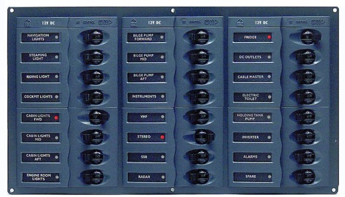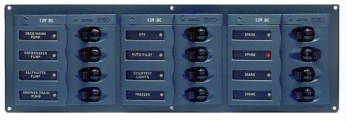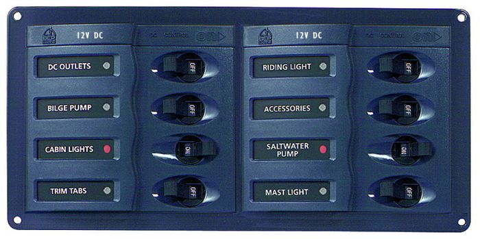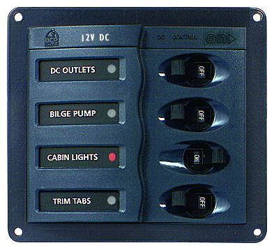 BEP900 DC PanelBEP DC panels all feature the standard stylish contour fascia, with red indicator lights and green backlighting. The panels listed below are all for 12V, but can easily be converted for 24V backlighting by adding appropriately rated resistors. Cutout size; 10mm inside all external dimensions. BEP900; 4 circuit breakers [1x5A, 2x10A, 1x15A], no meter. Supplied with label set 1 and a 6 way negative bus bar.