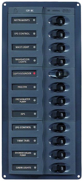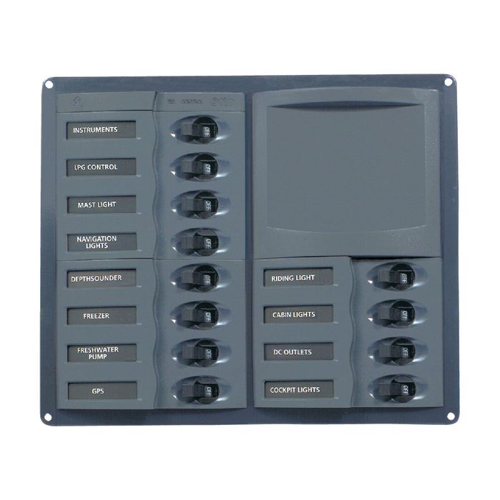 BEP902V DC PanelBEP902NMV; 12 circuit breakers [3x5A, 4x10A, 4x15A, 1x25A] in vertical configuration, no meter. Supplied with label set 1 and a 6 way negative bus bar.