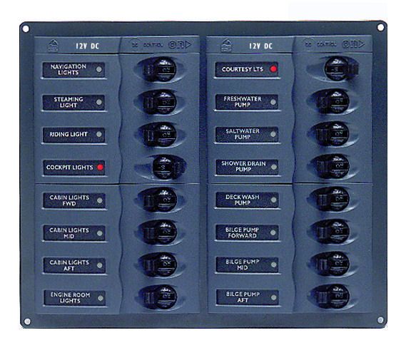 BEP904NM DC PanelBEP904NM; 16 circuit breakers [4x5A, 5x10A, 5x15A, 1x20A, 1x25A] in square configuration, no meter. Supplied with label set 1 and a 12 way negative bus bar.