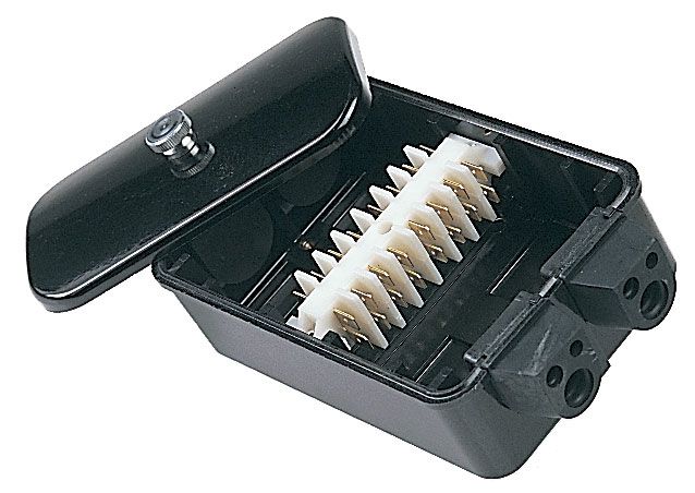 Electrical Connection BoxQuality bakelite box with brass fittings and rubber grommet giving waterproof cable entry points for multiple wire sizes. Ideal for professional or amateur electrical fit-ups. Complete with insulated terminal strips.